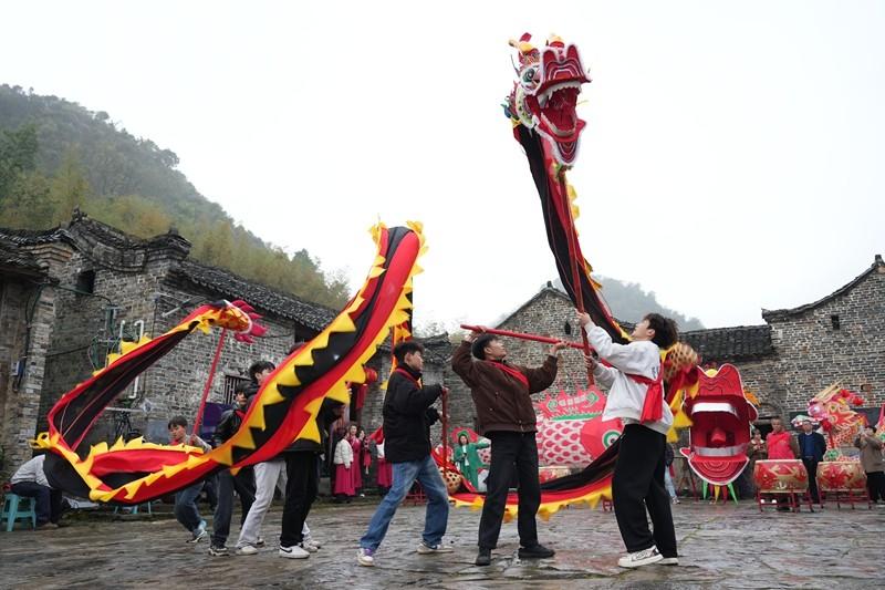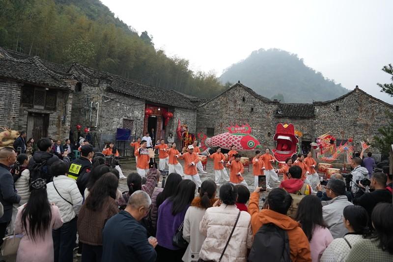上午9点08分,锣鼓铿锵、龙狮腾跃,“请龙出洞”民俗仪式正式拉开活动序幕。在随后进行的开耕仪式上,文龙环绕耕田,村民头戴斗笠、身穿蓑衣、驾驭牛犁,将龙文化与农耕文化有机融合。随后,草龙、文龙、板凳龙、醒狮、中国鼓、龙须草编秀等表演轮番上演。在欢快的长鼓舞、竹竿舞互动环节,观众与港澳台侨人士携手共舞,同根同源的文化温情在青山绿水间流淌交融,现场洋溢着喜庆热烈的节日氛围。